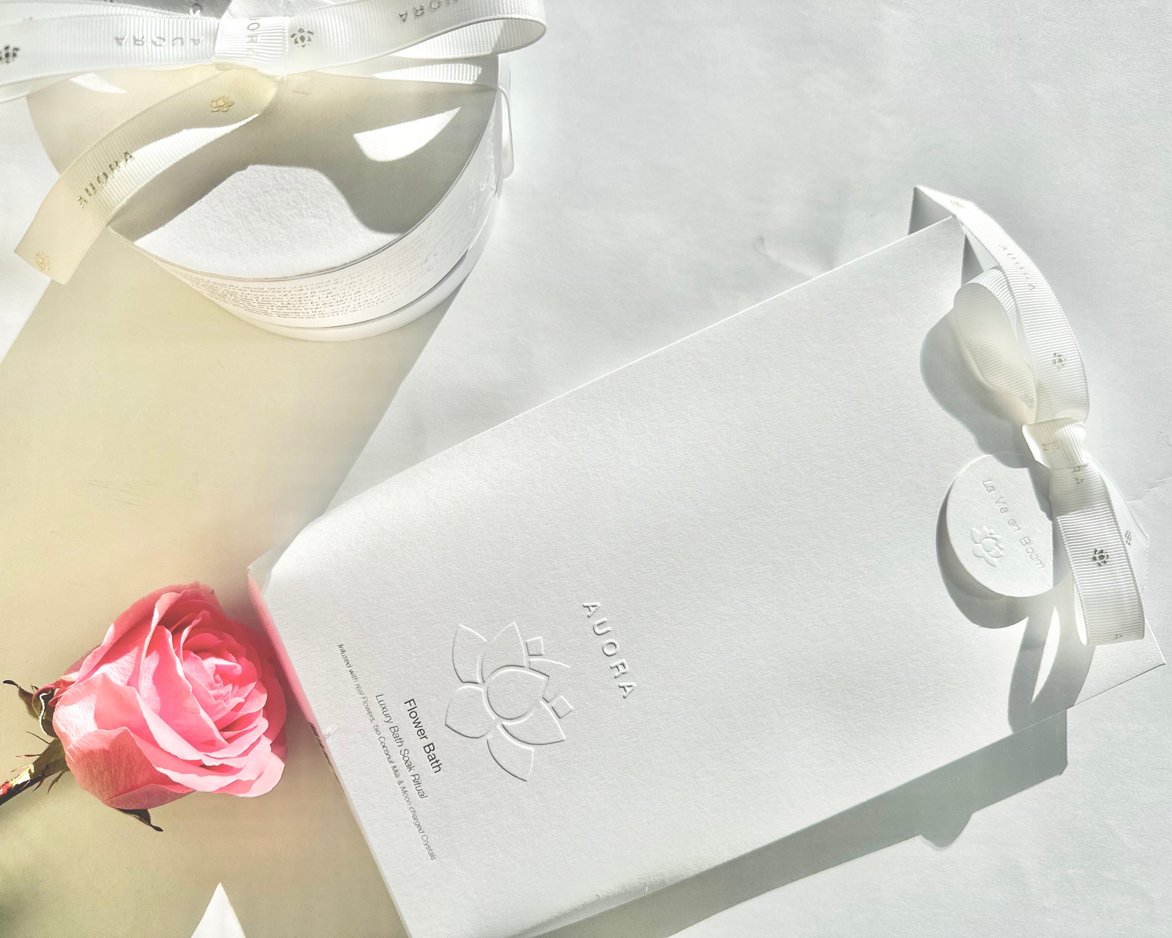 Flower Bath wird elegant in einer luxuriösen, kostenlosen Geschenkverpackung präsentiert, die mit einem Satinband verziert ist und von einem recycelbaren Beutel und einem Bio-Baumwollbeutel begleitet wird. Perfekt zum Verschenken vorbereitet, mit der Option für eine persönliche Nachricht, ist es ein aufmerksames Geschenk für Sie selbst oder einen besonderen Menschen, das sowohl Genuss als auch Raffinesse verkörpert.